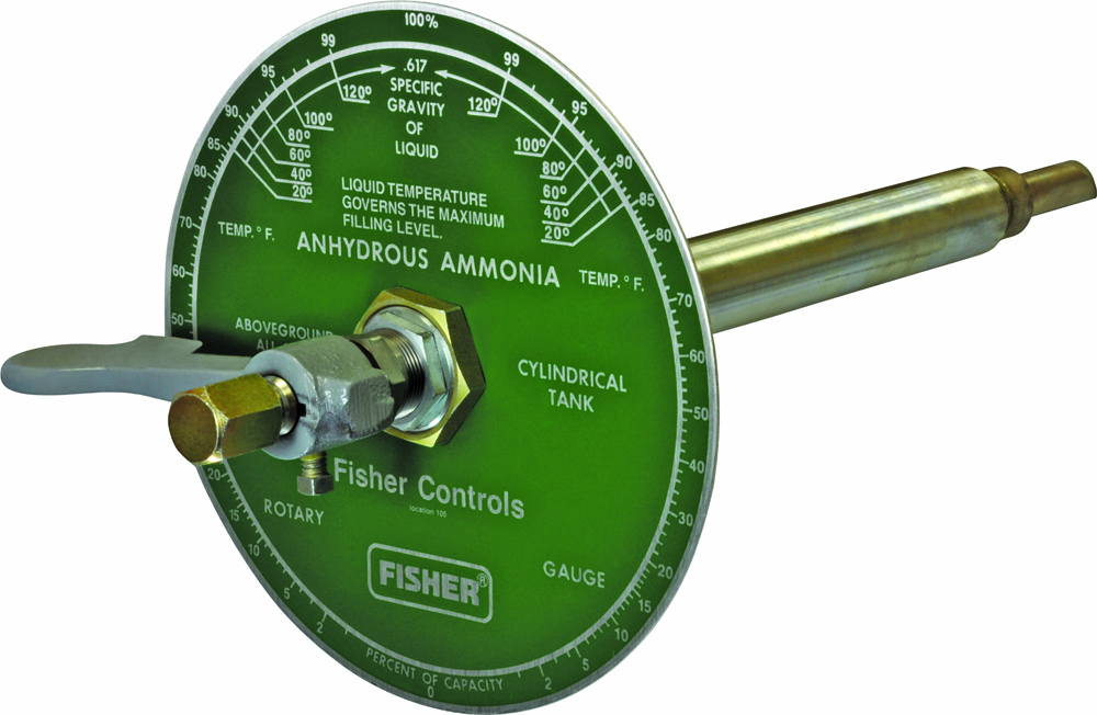 Fisher® brand rotary gauges can be used on stationary or mobile tanks to visually indicate the amount of Anhydrous Ammonia(NH3) in the container. They are also used in filling the tank to the proper liquid level. On mobile applications and some large stationary storage tanks, hangers are recommended to support the horizontal length of the diptube.