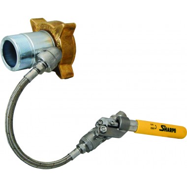 The ME135 discharge hose adapter allows transport hoses to be adapted to work with the ME807 LE Shutoff Valve while providing a flexible connection in the transport trailer hose bleed down lines.