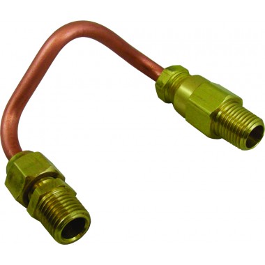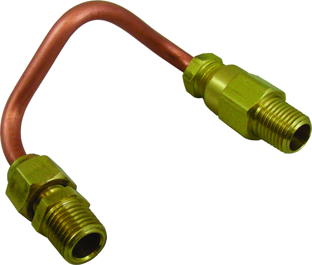 “Bypass Line Kit” is used to create a one-way closed loop between the upstream and downstream sides of a Marshall Excelsior 2” globe valve when used in conjunction with a ME868 Series low emission Acme adapter. The kit features a brass one-way check valve and preformed heavy wall copper tubing with brazed end fi ttings for durability. This product is intended to prevent over pressurization of the ME868 Series low emission Acme adapters making them truly low emission. This product will also greatly reduce pressures within the ME868 Series adapters thereby decreasing any wear that may occur to the shutoff valves or the low emission Acme adapter.